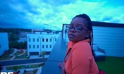 Stunner with glasses Katie Thomas gets to ride a ebony cock