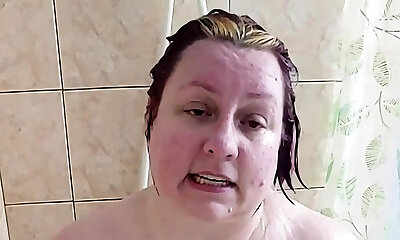 Mature milky BBW housewife in jeans and purple blouse in the kitchen