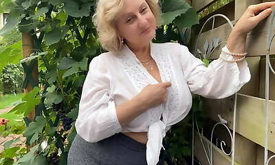 Striptease and Pee by chubby Mature naked blond outside in the garden courtyard