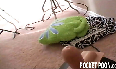 A mega-bitch in a pokemon pikachu costume fucks herself with hefty dildos and puts panties in her pussy